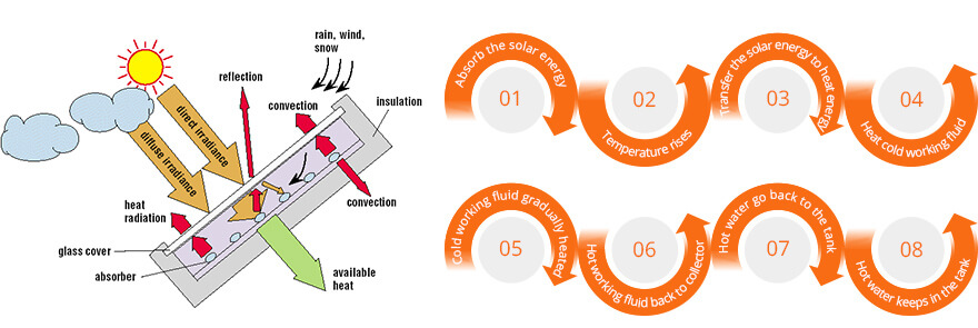 Converting solar energy into heat energy, then transferring the sunshine passed across the low iron safety transparent glass of the collector, which heats up, and gets a great amount of the radiation from the sun. Heat into working fluid, therefore the cold working fluid from the bottom of collector is gradually heated, so that temperature is rising. Finally the heated liquid is transferred back to the top of the collector of storage tank for using. Whole process is the useful energy collection. In the meantime, due to absorber plate temperature rise, only very little of the heat emitted by the absorber escapes the cover.